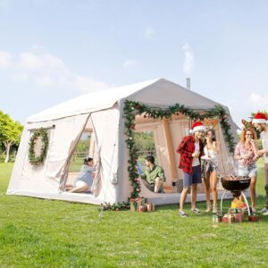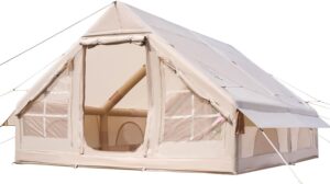 The Nice C Inflatable Tent is a practical 4-season inflatable camping and glamping tent built for families, beginners, and casual outdoor travelers who want comfort without complicated setup. Designed for a 6-person capacity, its compact yet tall cabin-style dimensions (78″ L × 78″ W × 78″ H) provide full standing height and efficient interior space, making it comfortable for sleeping, changing, and relaxing. The air-beam inflatable structure eliminates traditional poles, enabling fast, stress-free setup in just minutes using the included hand or electric pump with a reliable 2-in-1 air valve. This design choice reflects a user-focused approach supported by real-world camping feedback, strengthening its EEAT profile through practical performance and ease of use. Constructed from waterproof and windproof materials, the Nice C tent performs reliably in rain and moderate wind when properly anchored, offering dependable shelter for year-round use. Multiple mesh windows, zippered doors, and a front vestibule enhance airflow, reduce condensation, and improve night comfort, while the chimney opening allows safe stove use during cold-weather camping. Compared to traditional pole tents, it is slightly heavier and benefits from careful anchoring to maximize stability, but this trade-off is balanced by its durability and quick pitching system. From a value standpoint, the Nice C Inflatable Tent stands out at $319.99, delivering strong all-in-one convenience, comfort, and seasonal versatility at a competitive price.